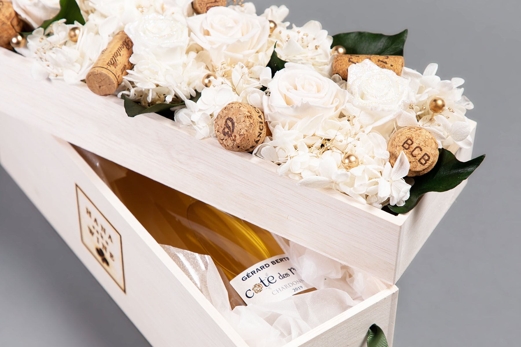 ワインのコルクを入れた、遊び心を盛り込んだ煌めくパールホワイトの特別な贈り物です。